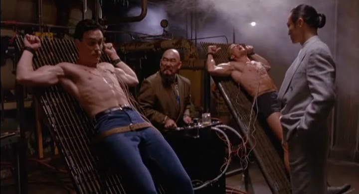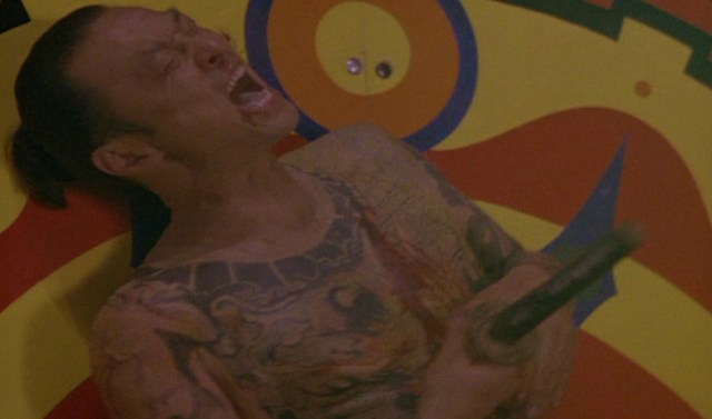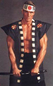 The Japan paranoia manifests in flashy Yakuza gangsters in horrible late 80s/early 90s suits, Made in Japan logos prominently displayed, Japanese men eating sushi off of naked women, a bathhouse, the horrors of Ice (which “makes crack look like decaf”) and a murderous pervert of a Yakuza Oyabun that does everything but kick a dog. The Yakuza goons act like film Samurai, with absolute loyalty to their boss (one breaks his own neck rather than talk to the police), quite silly seeming when, even in the 1960s Japanese films depict Yakuza honor as a thing of the past. Honorable they may be, but smart they are not. Showdown in Little Tokyo features some of the stupidest ever featured in a film, with Yoshida killing people on camera, shake downs right out in the open, and a repeated insistence in not simply murdering the heroes even though the opportunity continually presents itself.